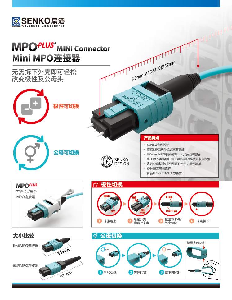 Jim 桑: 在今年的光博会上,扇港重点展示的新产品是针对数据中心应用的MINI MPO。这款产品的主要特色: 尺寸更短、极性可切换和公母可切换。尺寸方面,该迷你3.0mm MPO 总长仅37mm,为业界最短,相比传统MPO连接器的60毫米缩短近一半;施工时无需借助任何工具即可轻松改变卡点位置。此外,在进行公母切换时无需拆下外壳,操作非常简单。各种尾套可供选择。它不仅囊括了MPO的所有优点,并且性能表现卓越,符合IEC&TIA/EIA的要求。