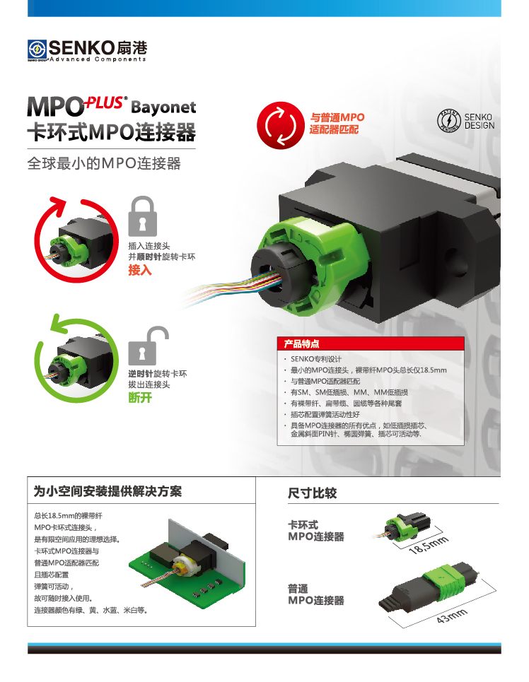 此外,扇港重点展示的还有一款针对小空间安装的卡环式MPO连接器(MPO PLUS Bayonet)。扇港声称,这款全球最小的MPO连接器是业界内最小的MPO连接器,裸带纤MPO头总长仅18.5mm(普通MPO连接器为43mm)。这款MPO可与普通MPO适配器匹配,是有限空间应用的理想选择。该插芯配置弹簧活动性好,且具备MPO连接器的所有优点,如低插损插芯、金属斜面PIN针、椭圆弹簧、插芯可活动等。