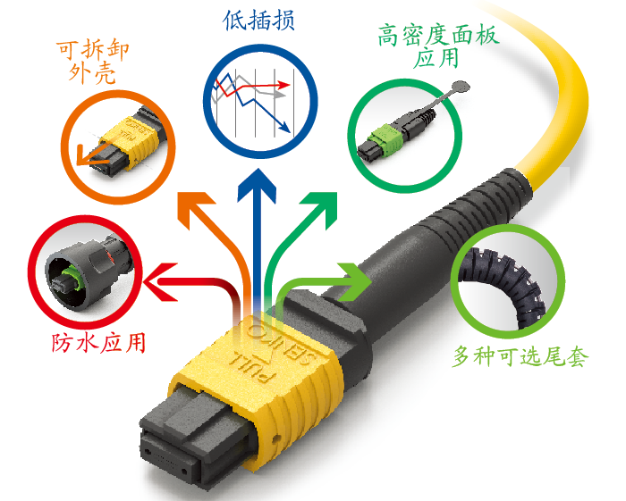 SENKO SM、MM MPO连接器用于数据中心和电信系统的高密度背板或PCB板。MPO连接头密度高达普通连接头的12倍,可大大节约空间并降低成本。